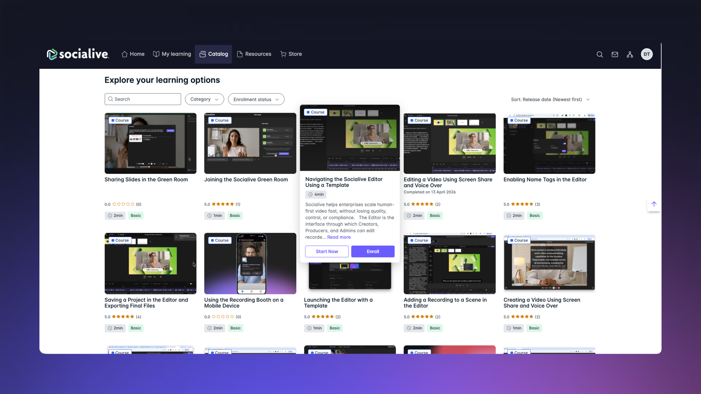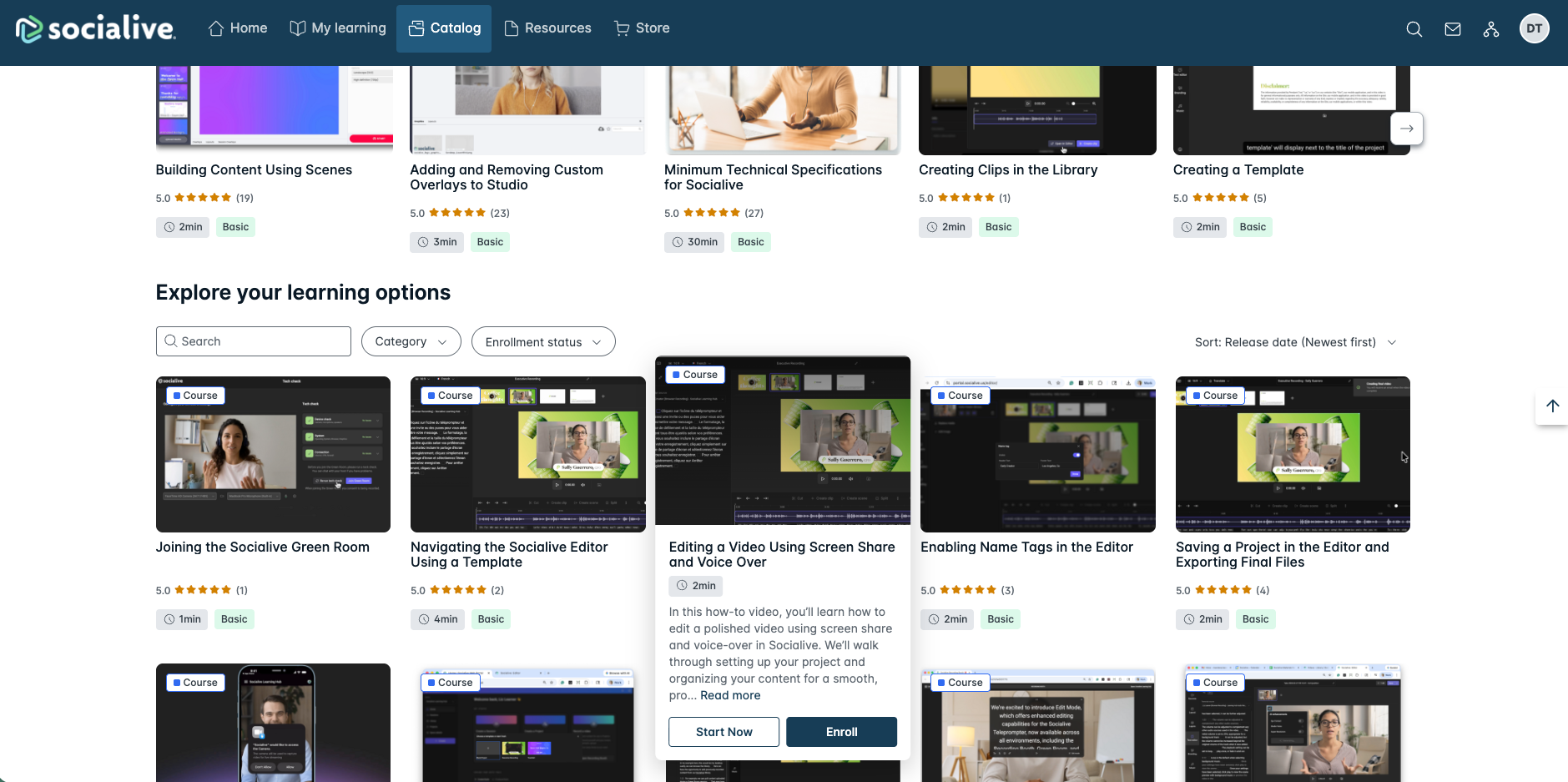Staying in the catalog, you can choose to sort content by release date, showing brand new workflows using the latest Socialive features.