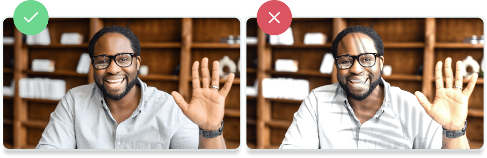 To be properly framed, position yourself in the center of your screen. Don't just be a floating head — make sure to include the top half of your chest in the frame like the example below.